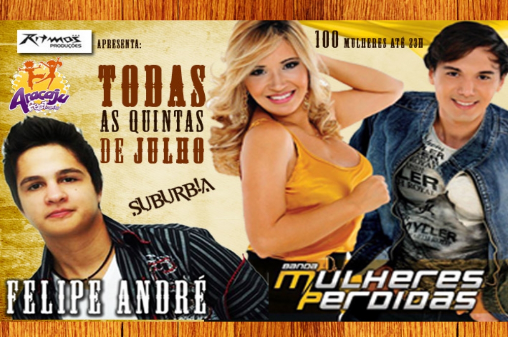No mês de julho tem Felipe André e Mulheres Perdida na casa de espetáculo Suburbia. A partir do dia 12, a partir das 22h, as quintas serão das atrações do casting da Ritmos Produções, sob o comando de Julio Viana. No evento, a banda Mulheres Perdidas apresentará seu mais recente show que inclui o novo CD e músicas que fazem a cabeça da galera. E o cantor do pop sertanejo, Felipe André, cantará os clássicos revisitados, juntamente com seu repertório próprio.