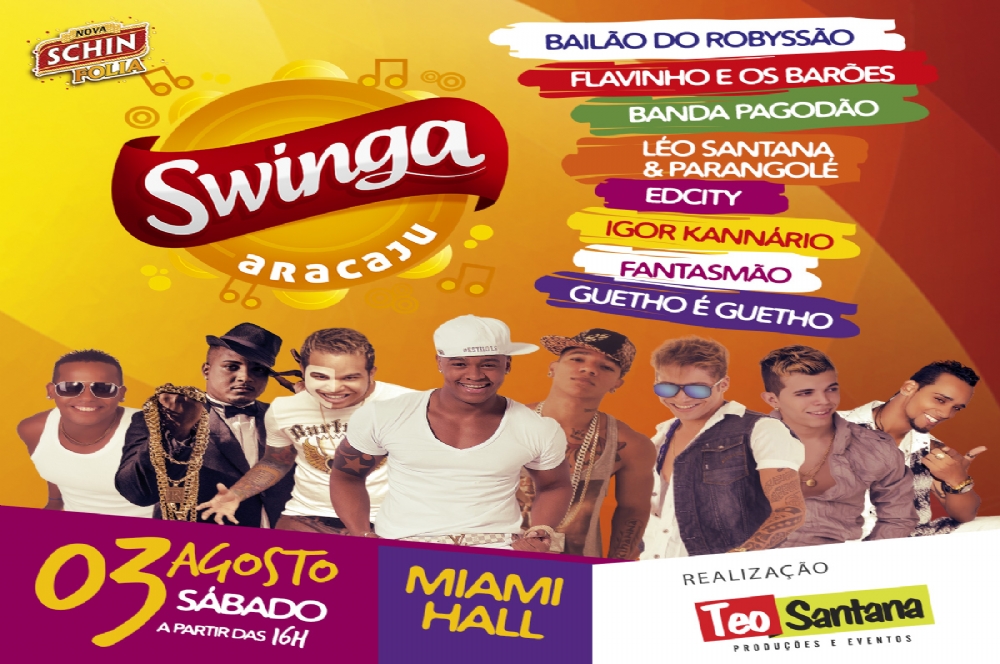 A maior festa de camisa colorida de Sergipe, Swinga Aracaju, já tem data definida e acontecerá no dia 03 de agosto no Miami Hall, localizado na Avenida Delmiro Gouveia. A festa se destaca como pioneira na mostra de pagode nacional e sergipano, no cenário sergipano, e em 2013 será realizada a terceira edição.