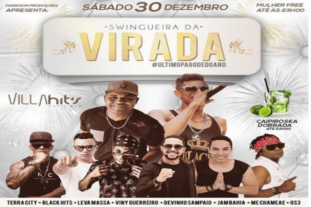 A Swingueira da Virada do Villa Hits acontece neste sábado, 30, a partir das 22h, com shows de Terra City, Black Hits, Leva Massa, Viny Guerreiro, Devinho Sampaio, Jambahia, Me chameae e OS3. A mulherada tem entrada free atpe às 23h. O Villa Hits fica na Avenida Beira Mar, em Aracaju.
