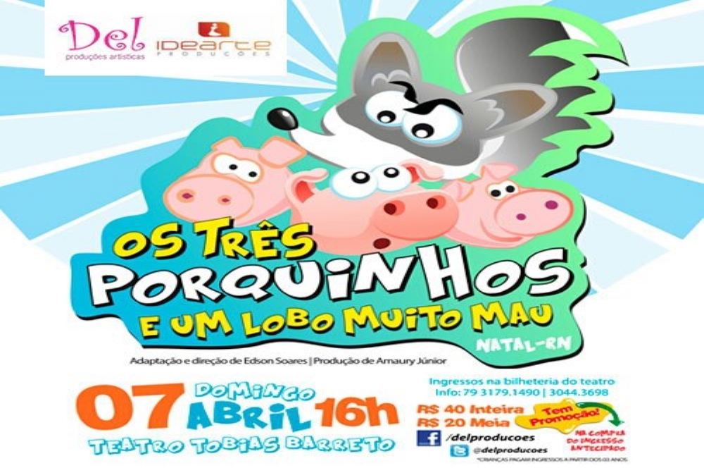 A Del Produções Artísticas e a Idearte Produções (Natal-RN), trazem para Aracaju, o famoso clássico infantil “Os Três Porquinhos e um Lobo muito Mau”. O espetáculo acontece dia 07 de abril, domingo, 16h, no Teatro Tobias Barreto. A história se passa na pequena Vila Natureza, onde vive o feliz açougueiro Pepy, que não vende carne de animal e sim, carne de frutas e vegetais. Um dia ele recebe uma difícil missão do velho e rabugento Sr.Nicolau, que a todo custo deseja comer carne de verdade, mas precisamente um pernil de porco.