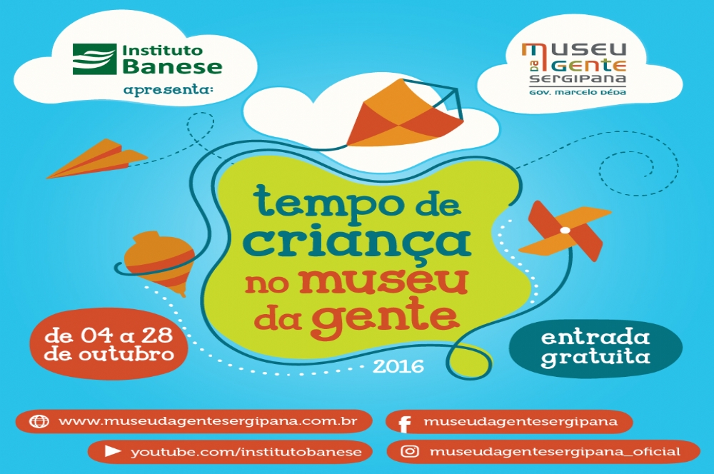 Vai começar o ‘Tempo de Criança’ no Museu da Gente Sergipana. E com ele muitos motivos para se divertir. É que uma programação especial foi preparada para a criançada comemorar o mês todinho dedicado a elas. O Tempo de Criança é uma realização do Instituto Banese e Governo de Sergipe, através do Museu da Gente Sergipana Gov. Marcelo Déda, e em parceria com o Café da Gente, Mostra Sercine de Cinema Infantil e o Centro de Aprendizagem Musical (CAM).