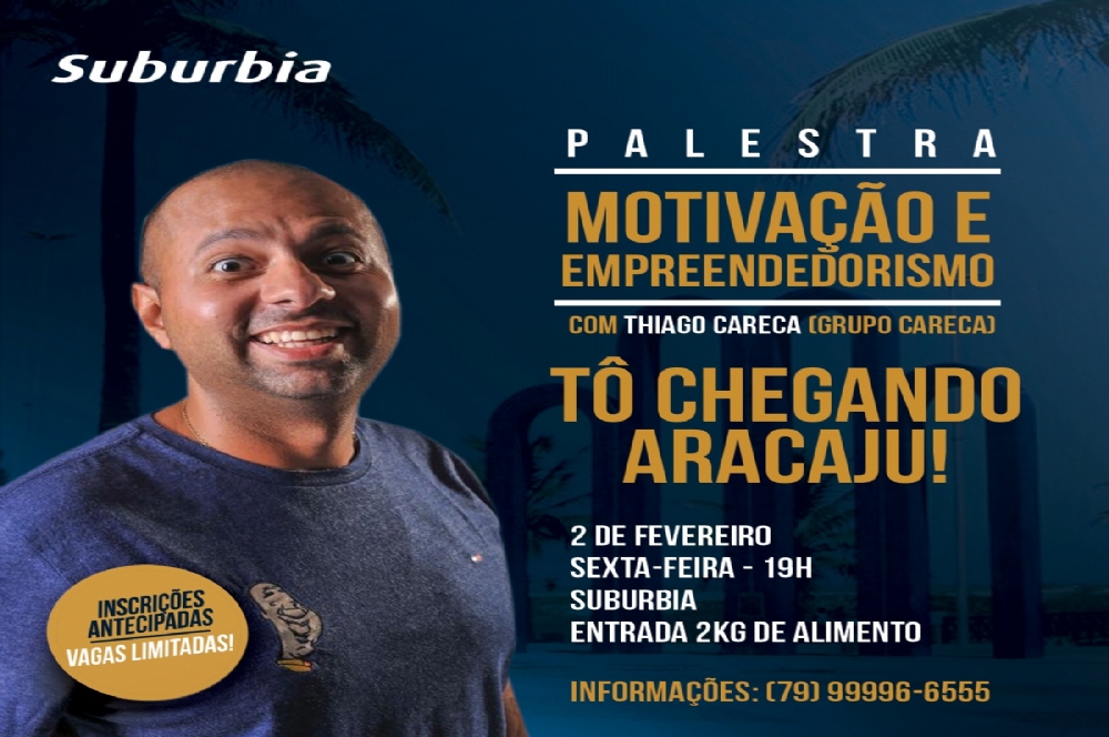 Famoso pela franquia "Sanduba do Careca", sucesso em Maceió e Recife, em breve em Aracaju, o empresário e palestrante Thiago Careca apresenta a palestra "Motivação e Emprendedorismo", nesta sexta-feira, 2 de fevereiro, às 19 horas, no Suburbia.