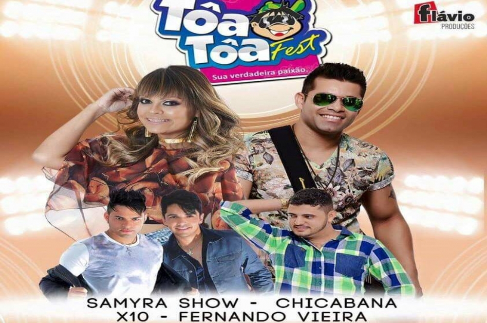A 10ª edição do Tôa Tôa Fest acontece no dia 20 de abril, a partir das 21h, na Praça de Eventos de Nossa Senhora da Glória. Samyra Show, Chicabana, X10 e Fernando Vieira são as atrações do evento. Os ingressos do 1º lote custam R$ 30 (pista) e R$ 50 (camarote).