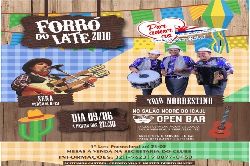 O tradicional Forró do Iate apresenta nesta edição 2018 o melhor do forró tradicional com duas grandes atrações. Fundado em 1958 em Salvador, o Trio Nordestino completa 60 anos de sucesso e história na música brasileira, com mais de 50 discos gravados. O cearense/sergipano Sena, com 33 anos de carreira no cenário sergipano apresenta seu show Forró na Roça com grandes sucessos do gênero e músicas autorais. A noite contará com Open Bar (cerveja, água de coco, água mineral, refrigerante e serviço para destilados e diversos) e quiosques com venda de comidas típicas. Mais informações na secretaria do clube pelos fones (79) 3211-9623 / 98877-0450. Imperdível!