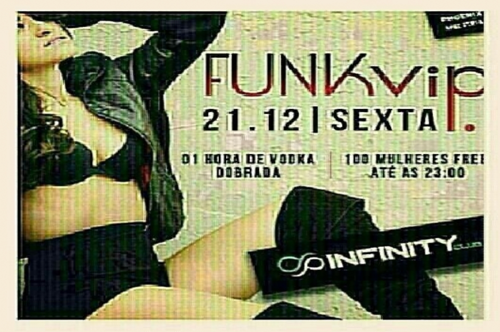 Nesta sexta-feira, 21, acontece o último Funk Vip do ano na Infinity Club. A galera que curte a festança deve se adiantar por que a noite promete. As 100 primeiras mulheres terão entrada free até às 23h e durante uma hora a vodka é dobrada. Garanta seu ingresso antecipado na loja Inquérito no shopping Jardins.