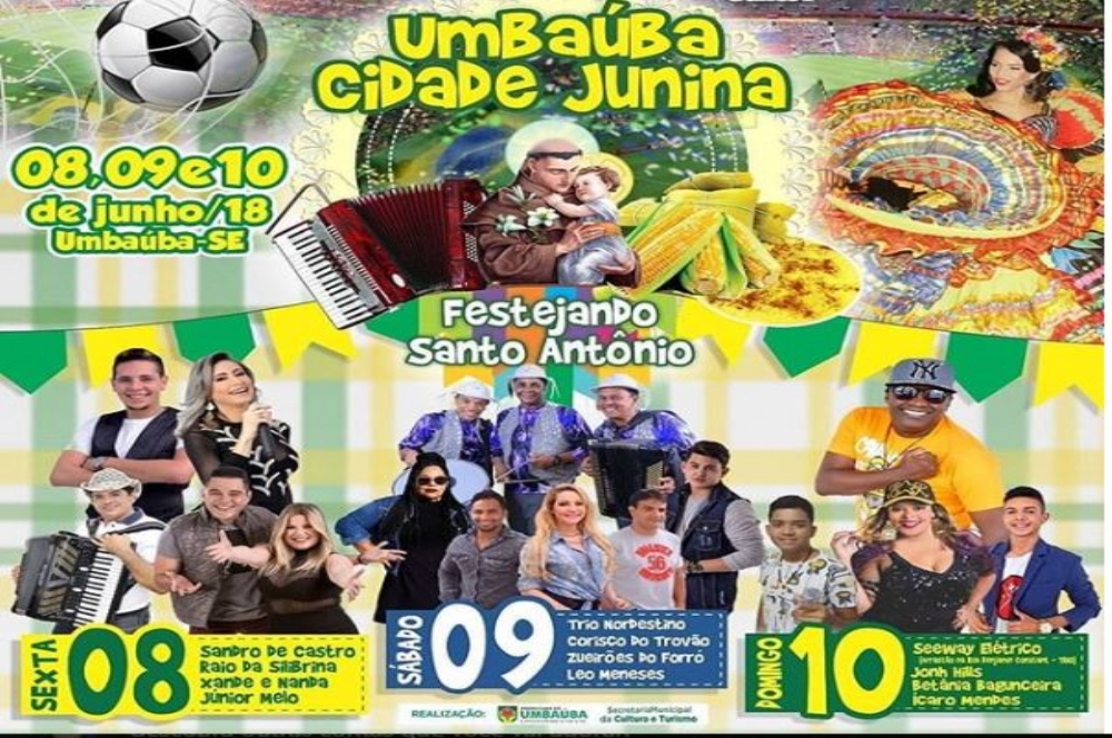 A festa Umbaúba Cidade Junina acontece nos dias 8, 9 e 10 de junho com atrações locais e nacionais.