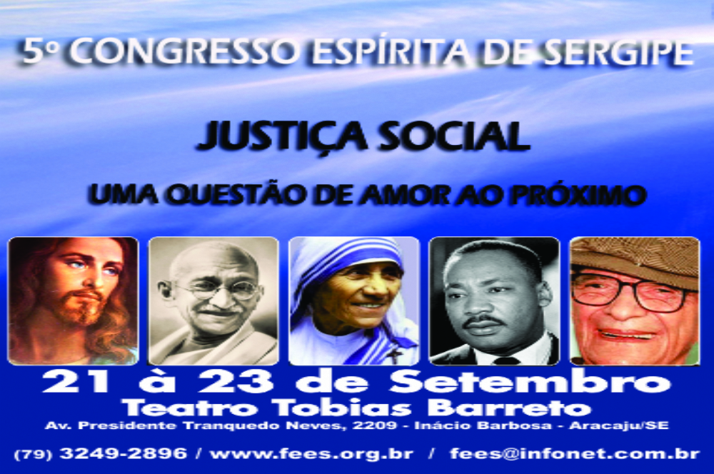 A Federação Espírita do Estado de Sergipe, com apoio das 84 instituições do Estado, realizará o 5º Congresso Espírita de Sergipe no período de 21 a 23 de setembro, no teatro Tobias Barreto. Expositores de renome nacional, além de abordar diversos assuntos, irão discutir sobre o tema central “Justiça social, uma questão de amor ao próximo”.