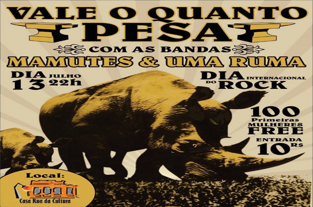 "Vale o quanto pesa". Esta é o nome da festa que celebrará o Dia Internacional do Rock ao som das bandas Mamutes e Uma Ruma. O evento acontece no dia 13 de julho, a partir das 22h, na Casa Rua da Cultura, localizada na Praça Camerino.