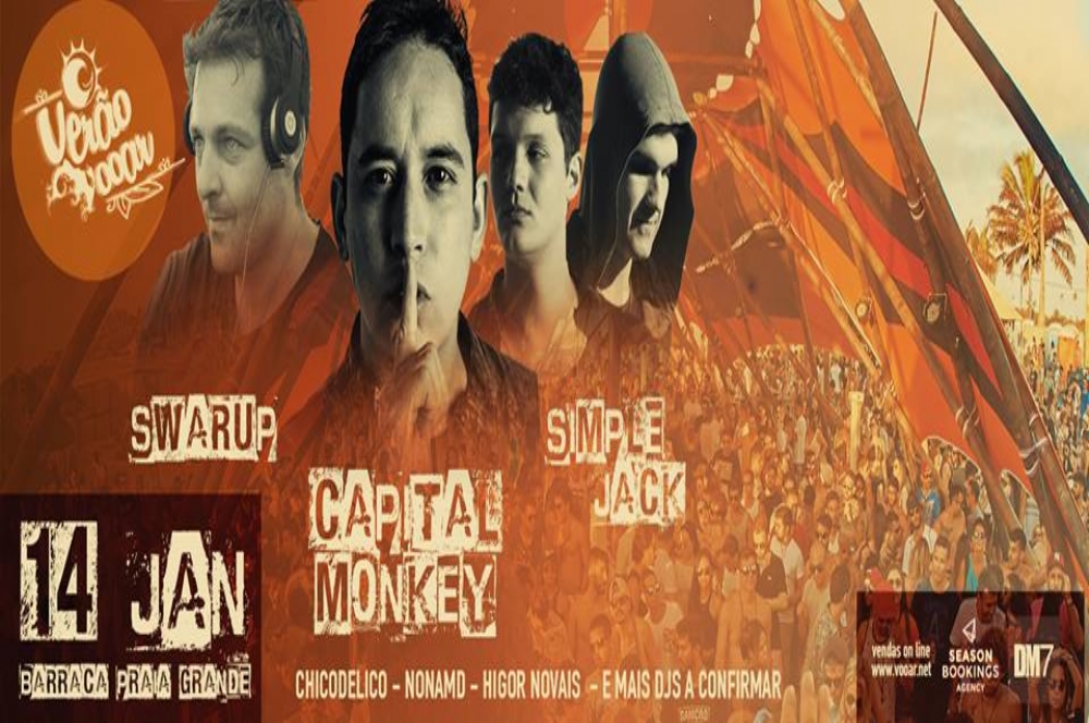 O primeiro show do Verão Vooar em Sergipe acontece no dia 14 de janeiro com Swarup, Capital Monkey e Simple Jack. Também participam do evento os Djs Chicodelico, Nonamd e Higor Novais.