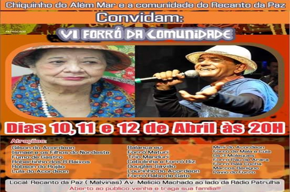 Chiquinho do Além Mar e a comunidade do Recanto da Paz convidam para o VI Forró da Comunidade que acontece nos dias 10,11 e 12 desse mês às 20h. A festa este ano vai homenagear os cantores Clemilda e Rogério, que faleceram no ano passado.