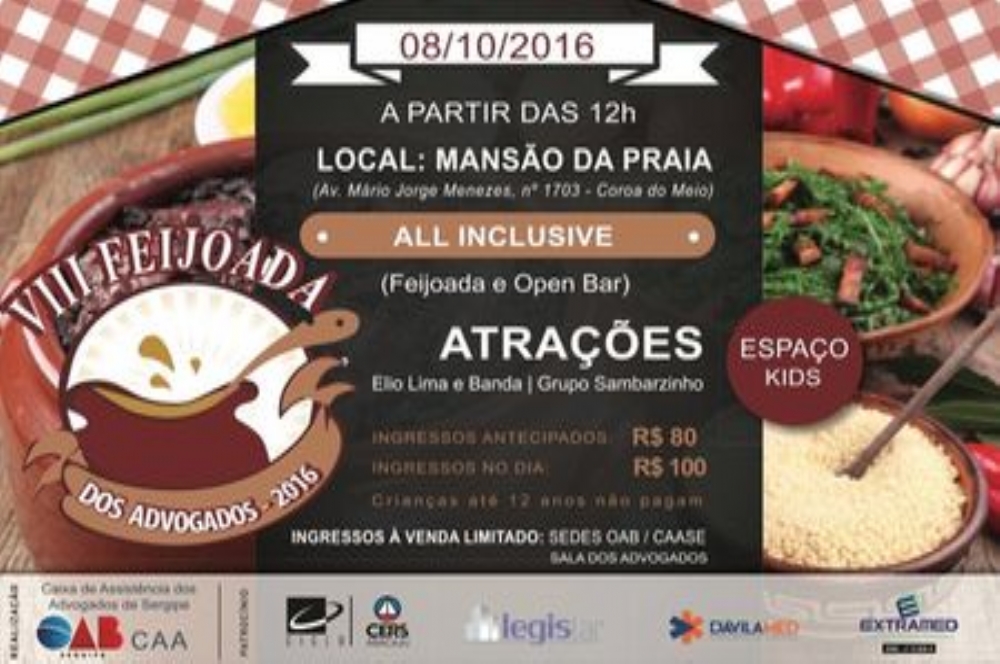 No dia 08 de outubro, será realizada a VIII Feijoada dos Advogados. O evento, que já virou tradição entre a advocacia sergipana e o público em geral, terá início às 12h, na Mansão da Praia localizada na Avenida Mário Jorge Menezes, 1703, no Bairro Coroa do Meio, Zona Sul de Aracaju. A organização é da Ordem dos Advogados do Brasil – Seccional Sergipe, através da Caixa de Assistência dos Advogados – CAASE.