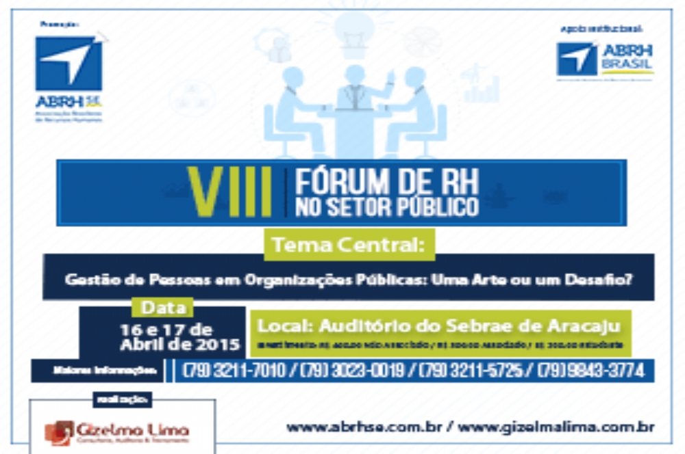 A Associação Brasileira de Recursos Humanos – ABRH-SE, vinculada ao sistema ABRH BRASIL, realizará o VIII Fórum de RH no Setor Público, nos dias 16 e 17 de Abril, no auditório do SEBRAE SE.