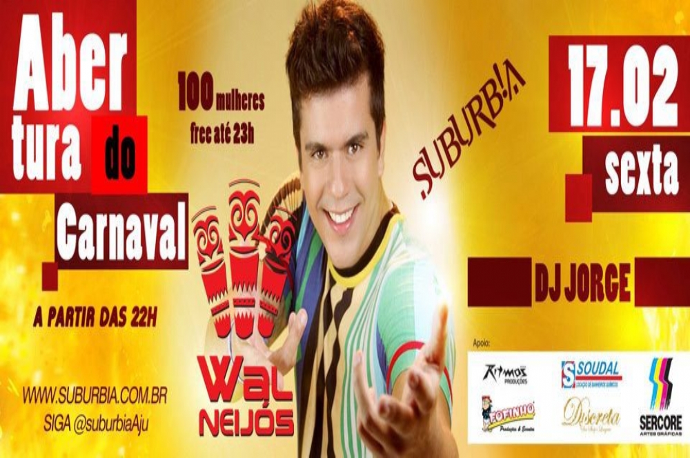 O carnaval de Aracaju começa sexta, dia 17, no Suburbia, a partir das 22h. A festa traz a banda Walneijós para comandar a galera. Com mais de 30 anos de carreira, a banda vai agitar o local com seus hits “Beijar só por beijar” e “Medusa”, e canções que são sucesso na mídia. Os ingressos podem ser adquiridos na bilheteria da casa de shows. Até as 23h, as 100 primeiras mulheres não pagam.