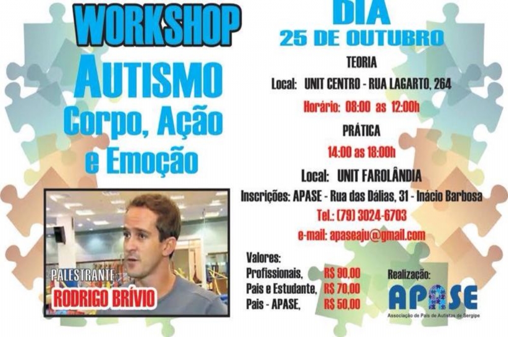 Acontece em Aracaju, neste sábado, 25, o workshop 'Autismo – Corpo, Ação e Emoção com o professor de Educação Física Rodrigo Brivio. O workshop terá início às 8h e tem término programado para as 18h, e se dará em duas partes: teoria e prática. A primeira parte ocorrerá no campus Centro da Universidade Tiradentes, já a segunda no campus Farolândia.