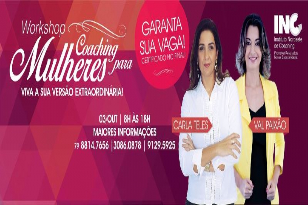 A Master Coach Carla Teles e a Business e Executive Coach Val Paixão promovem no dia 3 de outubro, o Workshop Coaching para Mulheres. Este programa é preparado para você mulher que está em busca de sua essência, interessada em crescer e desenvolver sua vida pessoal e profissional. É para você que deseja alcançar novos caminhos, conquistar/criar oportunidades e vencer desafios.