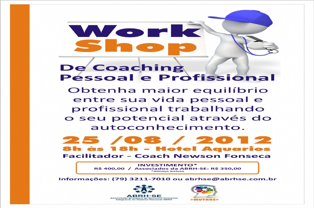 Com o objetivo de proporcionar uma reflexão sobre os conceitos de visão e missão de cada participante, através de uma melhor congruência e motivação interna, movido por um melhor entendimento dos seus valores e de suas crenças pessoais, será realizado no dia 25 de agosto, das 8h às 18h, no hotel Aquarios, o Workshop ‘De Coaching Pessoal e Profissional’.