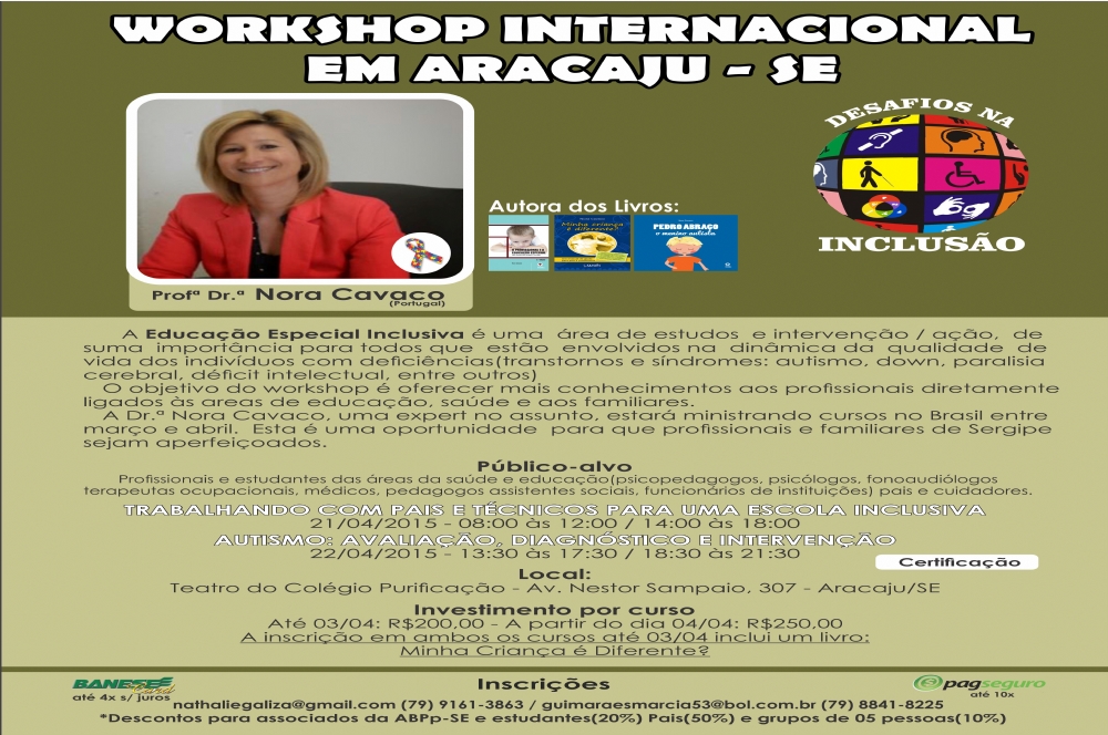 A Educação Especial Inclusiva é uma área de estudos e ação / intervenção de suma importância para todos os que estão envolvidos na dinâmica da promoção de qualidade de vida dos indivíduos com deficiências e seus familiares.. A Dra. Nora Cavaco uma expert no assunto, e estará ministrando cursos no Brasil no período de março e abril do corrente ano, em diversos Estados a exemplo do CE, BA, DF, SP, RS), e gostaríamos de incluir Sergipe no seu roteiro de trabalho, sendo esta uma oportunidade ímpar para que profissionais e familiares sejam aperfeiçoados nos cuidados com este público sem necessitarem se deslocar para outros estados. Porém, para que seja possível a realização deste evento de nível internacional em Aracaju, apoios e patrocínios são necessários.