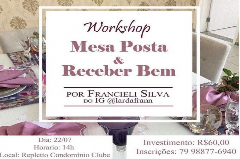 No próximo sábado, 22, a consultora em mesa posta, Francieli Silva, realiza a segunda edição do Workshop ‘Mesa Posta e Receber Bem’. O evento é voltado para mulheres interessadas em cuidados com a casa.