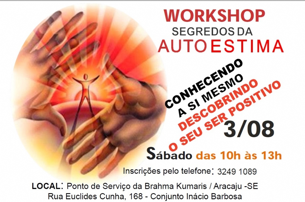 O workshop "Segredos da Autoestima" trabalhará a temática "conhecendo a si mesmo e descobrindo seu poder positivo". O evento acontece no sábado, 3 de agosto, das 10h às 13h, no ponto de serviço da Brahma Kumaris, localizado na rua Euclides da Cunha, 168, Inácio Barbosa. As vagas são limitadas e as inscrições antecipadas podem ser realizadas através do telefone (79) 3249 1089.