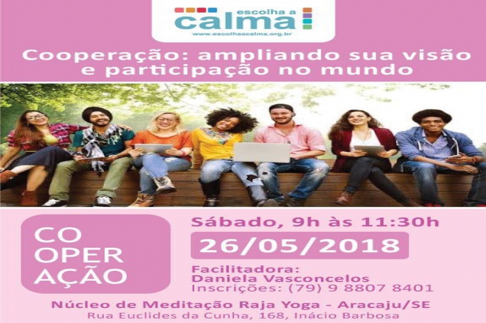 A escola de meditação, ONG Brahma Kumaris em Aracaju traz um novo Workshop da Campanha ‘Escolha a Calma’. A facilitadora Daniela Vasconcelos falará sobre o tema Cooperação: ampliando sua visão e participação no mundo` no sábado, 26, às 9h, no Núcleo de Meditação Raja Yoga. A participação é gratuita.