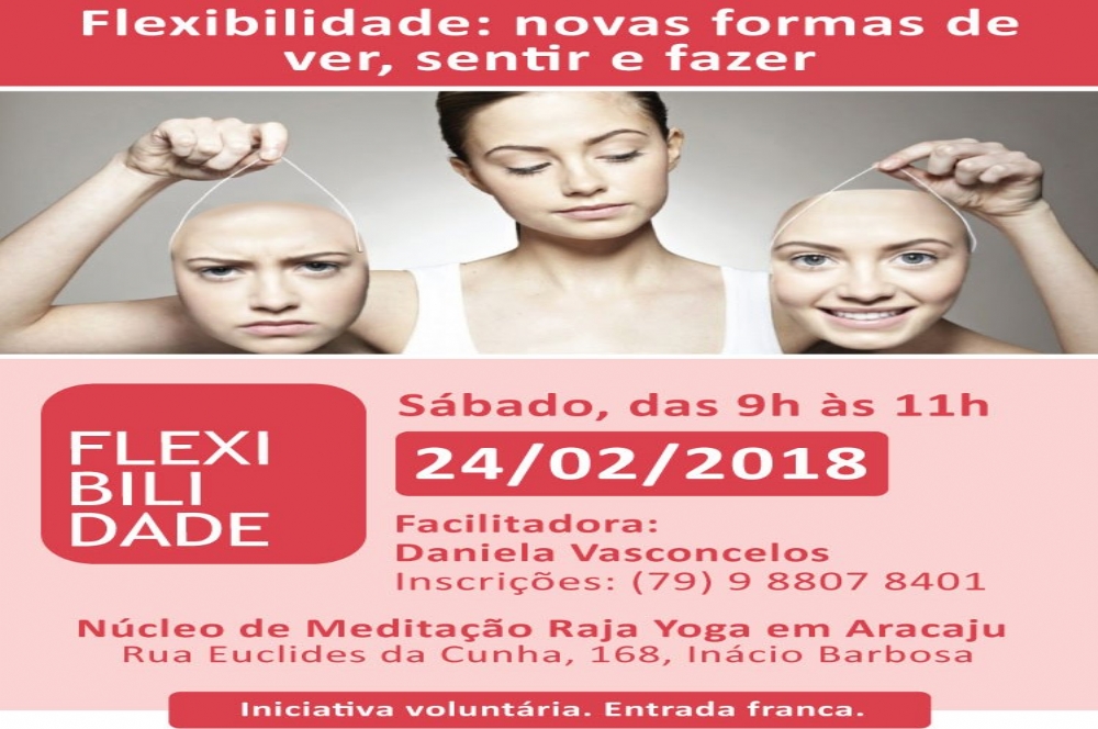 A ONG Brahma Kumaris em Aracaju traz um novo workshop da campanha ‘Escolha a Calma’. A facilitadora Daniela Vasconcelos falará sobre o tema ‘Flexibilidade: novas formas de ver, sentir e fazer`. O evento acontece no sábado, 24, às 9h, no Núcleo de Meditação Raja Yoga. A participação é gratuita.