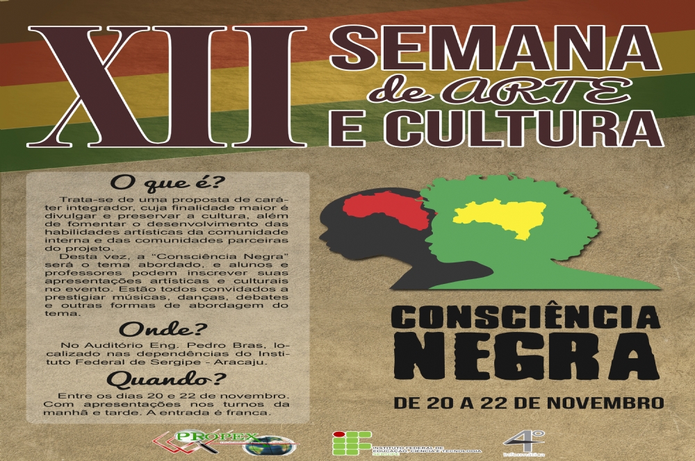 A XII Semana de Arte e Cultura do Instituto Federal de Sergipe comemorando a Consciência Negra acontecerá nos dias 20 a 22 de Novembro, podendo participar projetos de cunho cultural e livre temática. A semana comemorará acima de tudo a liberdade, a livre escolha de temas e demonstrações culturais, sem amarras! Multiplicidade e livre temática é assim que comemoramos a Consciência Negra.