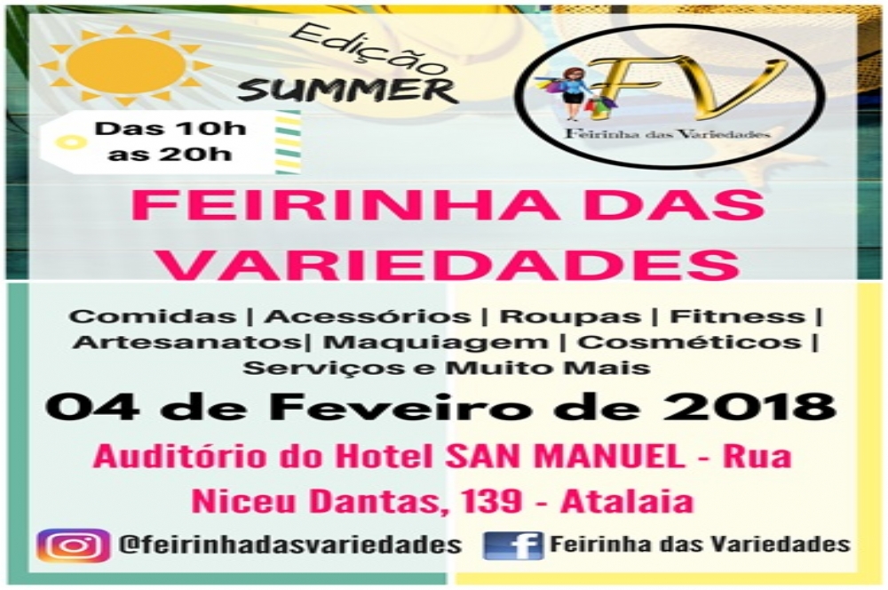 A edição Summer da Feirinha das Variedades acontece no dia 4 de fevereiro, das 10h às 20h, no auditório do Hotel San Manuel, que fica na avenida Niceu Dantas, n° 139, Atalaia.