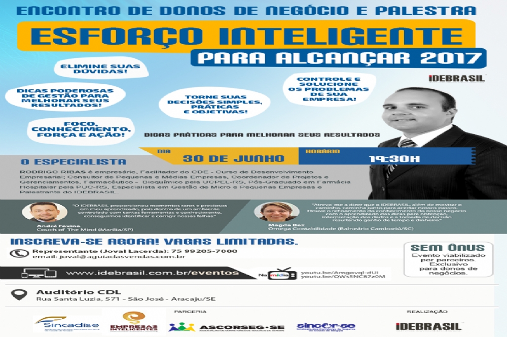 No final desse evento será lançado um projeto de capacitação em gestão empresarial que está fazendo a diferença na vida dos empresários de todo o brasil. Informações e confirmação de presença através do site: www.idebrasil.com.br/agenda ou pelo fone: (79) 99849-8415.