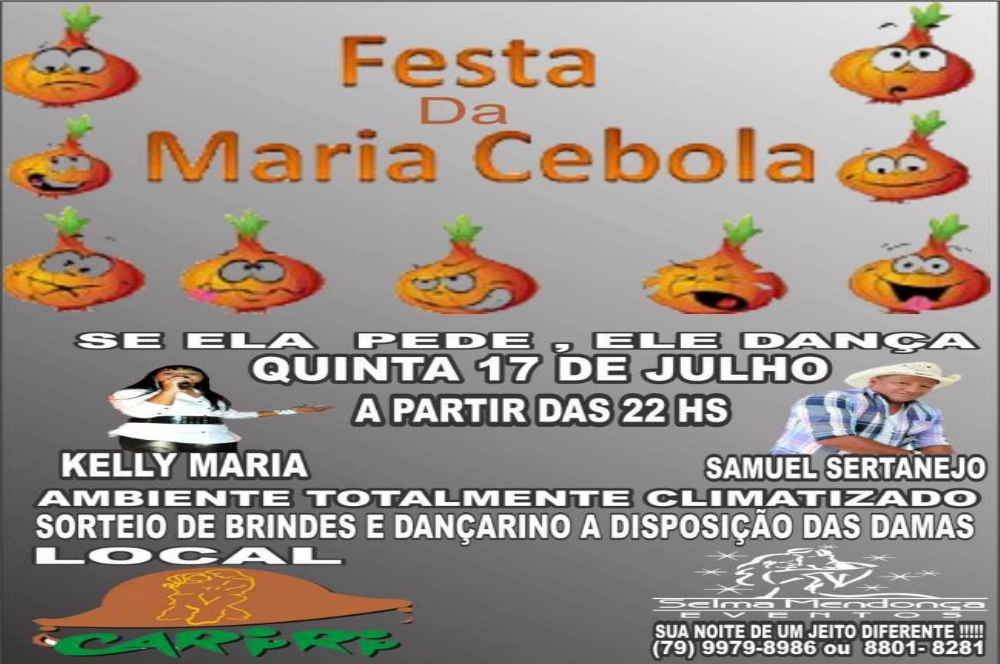 Kelly Maria e Samuel Sertanejo são as atrações da 4ª Festa da Maria Cebola que acontece no dia 17 de julho, a partir das 22h, no Cariri. A entrada custará R$ 20, mas as mesas só serão vendidas no dia e local do evento.