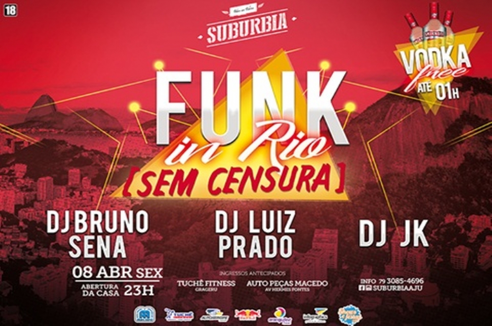 Nesta sexta-feira, 8 de abril, o Suburbia abre as portas para receber a 2ª edição da balada ‘’Funk In Rio Sem Censura’’ com o melhor do funk carioca tocado pelos Dj’s Bruno Sena, Luiz Prado e JK. A abertura da casa será às 22 horas e a Vodka é FREE até 1 da manhã.