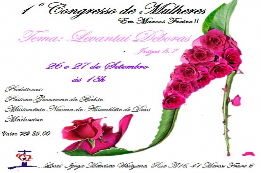 Com o tema “Levantai Déboras”, o 1º Congresso de Mulheres acontece nos dias 26 e 27 de setembro, a partir das 18h, na Igreja Metodista do Marcos Freire II. O valor da inscrição é R$ 25. Informações e inscrições através do telefone (79) 3256 5596 e 8863 3431.