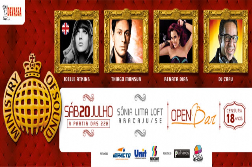 O maior selo de música eletrônica do mundo chega a Aracaju trazendo uma noite de luxo, conforto e muita animação. A Ministry of Sound Aracaju ocorre no dia 20 de julho, no Sônia Lima Loft, a partir das 22h. No primoroso line-up, os Djs Joelle Atkins, Thiago Mansur, Renata Dias e Caju comandam a festa.
