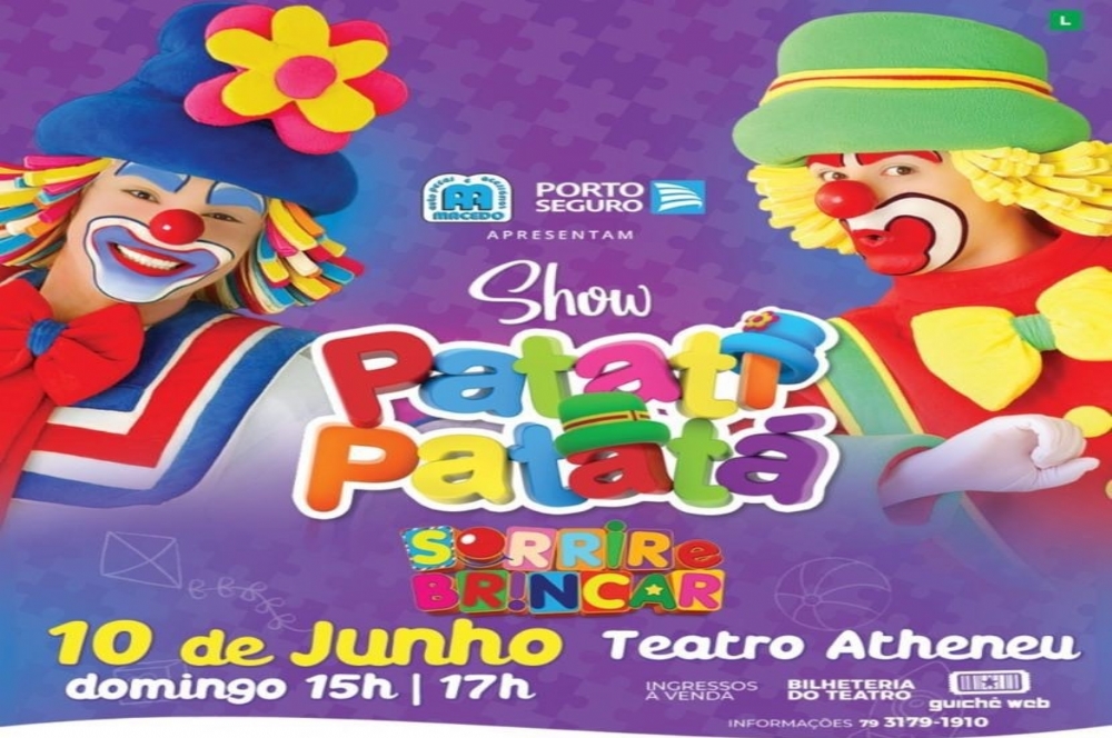 A dupla de palhaços mais amada da América Latina, Patati Patatá, estará em Aracaju com a turnê “Sorrir & Brincar”. Promovido pela Rinaldi Produções, em parceria com a Villela Produções, o espetáculo será realizado no dia 10 de junho no Teatro Atheneu. Os ingressos para as duas sessões estão à venda no Guichê Web ou na bilheteria do teatro. Crianças de até dois anos não pagam.