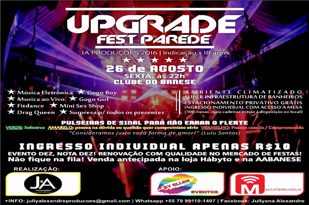 A J A Produções traz a Upgrade Fest Parade, em parceria com a Empresa Promotora de Eventos By Ellen, know how em festas alternativas, inovação no mercado de Sergipe, com qualidade e preço baixo. O ingresso custa apenas R$10, à venda antecipada na Loja Hábyto ou, na data do evento, no local. +INFO: jullyalexandreproducoes@gmail.com / WhatsApp: (79) 99110-1497 / Facebook: Jullyana Alexandre (J A Produções).