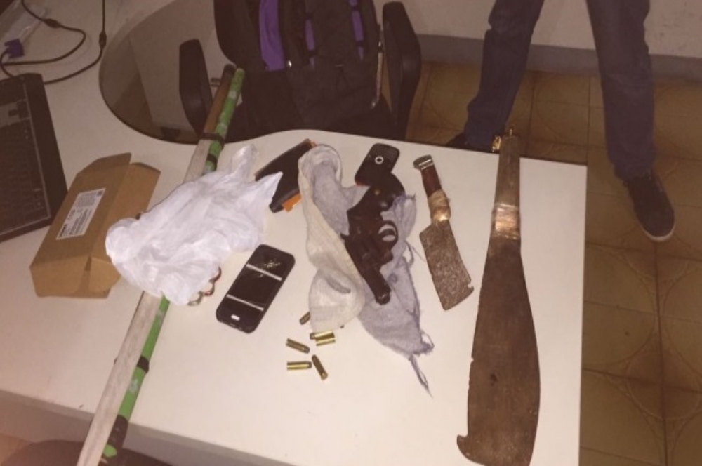 Na ação foram apreendidas uma arma de fogo calibre 38 de numeração raspada, 13 munições calibre .38, sendo três deflagradas, além de um simulacro de espingarda calibre .12, uma soqueira, dois machados, duas mochilas com roupas e dois aparelhos celulares.