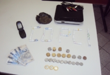 A polícia apreendeu cerca de R$ 40 em notas de pequenos valor, 30 papelotes de maconhas, e mais 100 gramas da droga e um aparelho DVD.