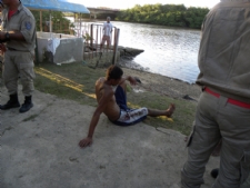 O tenente da Polícia Militar, Josebel Silveira do Nascimento estava almoçando no restaurante do Parque dos Cajueiros, quando ouviu gritos e correu para o píer. “Eu tinha acabado de chegar para almoçar com a minha esposa quando ouvimos gritos de que tinha um homem se afogando. Quando vi que “Eu recebi um comunicado via telefone dando conta que tinham dois homens se afogando, peguei a moto e vim pra cá imediatamente pois sou mergulhador de resgate. Quando cheguei percebi que era apenas uma vítima que estava sendo salva por um tenente da PM. Fui até eles e fiz o resgate. Era apenas um homem se afogando e não dois como fomos informados”, destaca o sargento Sinério dos Santos, do Corpo de Bombeiros. Visivelmente alcoolizado, José Eduardo dos Santos, tentava a todo instante explicar o que tinha acontecido. “Eu não tenho nada a ver. Ele tava bebendo aqui e depois pulou no rio. Eu vi que ele tava morrendo e pulei também. Eu saí e ele ficou”, diz. Inconsciente O rapaz recebeu os primeiros-socorros ainda no local por meio Sargento Sinério fez o resgate Por Aldaci de Souza