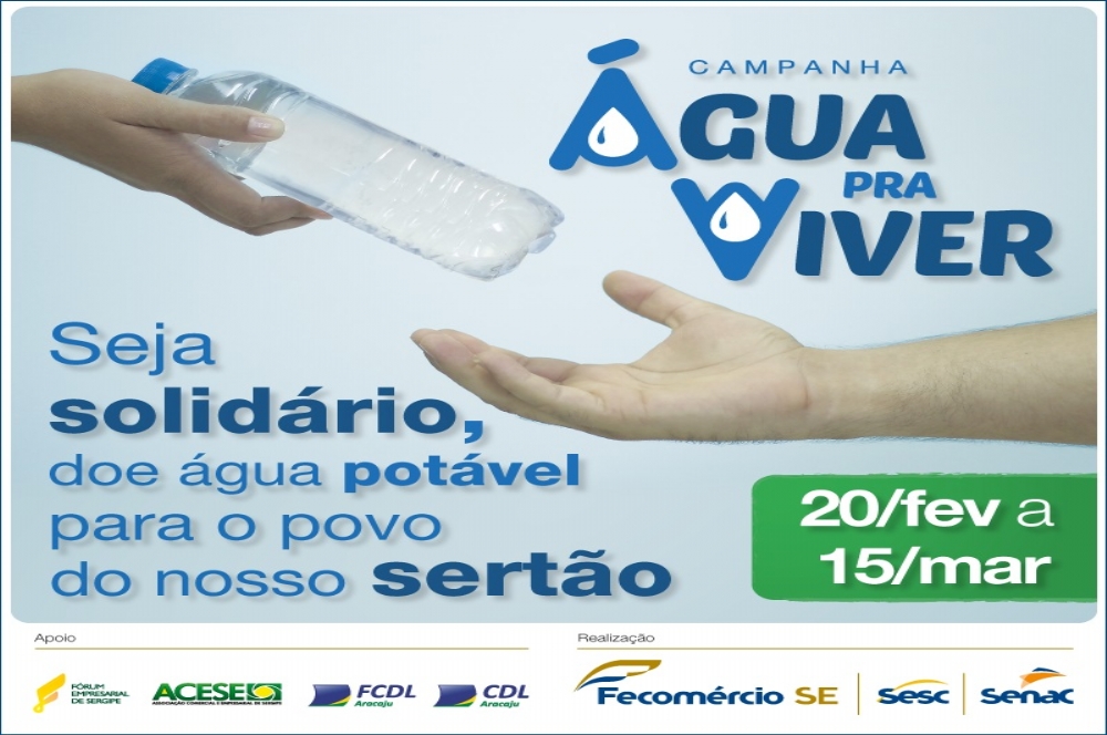 Nesta segunda-feira, 20, é iniciada a campanha “Água pra Viver”, em prol da população sertaneja, atingida pela seca que assola o interior de Sergipe desde o ano passado. A campanha visa sensibilizar a sociedade para a doação de água potável para consumo humano, em qualquer quantidade, nas unidades do Sesc, Senac e instituições empresariais que estão dando apoio a esta iniciativa, a exemplo da CDL (Câmara dos Dirigentes Lojistas), FCDL (Federação das Câmaras dos Dirigentes Lojistas), Acese (Associação Comercial e Empresarial de Sergipe) e Fórum Empresarial de Sergipe.