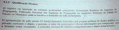 Ela teria deixado de apresentar, nos dois atestados, o período e o valor do contrato de serviços prestados anteriormente pela agência.