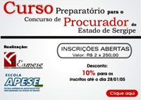 A partir do próximo dia 31, a Associação do Procuradores do Estado de Sergipe (APESE), promove um curso preparatório para o concurso de procurador do Estado de Sergipe. Serão ministradas 175 horas/aulas, de segunda à sexta-feira, das 19 às 22 horas, e aos sábados das 8 às 12 horas.