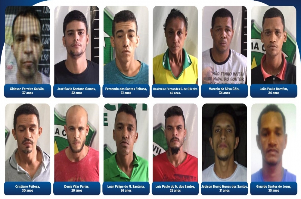 Até o momento foram presas as seguintes pessoas: Rosimeire Fernandes Sales de Oliveira, 40 anos; João Paulo Bomfim, 24; Fernando dos Santos Feitosa, 31; Marcelo da Silva Góis, 34; Ginaldo Santos de Jesus, 35; José Savio Santana Gomes, 22; Cristiano Feitosa, 30; Luiz Paulo do Nascimento dos Santos, 28; Luan Felipe do Nascimento Santana, 26; Denis Vilar Farias, 29; Jadison Bruno Nunes dos Santos, 31 e Glabson Ferreira Galvão, 37. Durante a ação um adolescente foi apreendido por ato infracional análogo ao crime de tráfico de drogas.