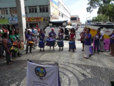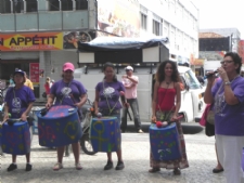 “Salsa, cebola, cebolinha, mulheres não foram feitas só para cozinha…”. A cantoria chamou a atenção de várias pessoas que passaram pelo calçadão da rua de João Pessoa, localizada no Centro da capital, na manhã desta sexta-feira, 18. O ato público que contou com a batucada de mulheres da Marcha Mundial das Mulheres em Sergipe (MMMSE) marcou o encerramento dos trabalhos desenvolvidos em virtude das comemorações pela passagem do Dia Internacional da Mulher [8 de março].