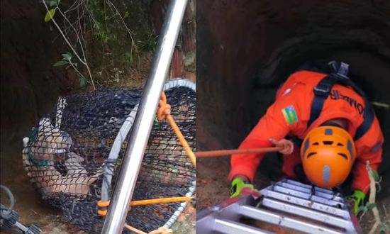 Para o resgate do animal, um dos bombeiros desceu até o fundo da cisterna e utilizou técnicas de salvamento terrestre para retirá-lo com segurança. O cão foi salvo com sucesso e devolvido aos seus tutores.