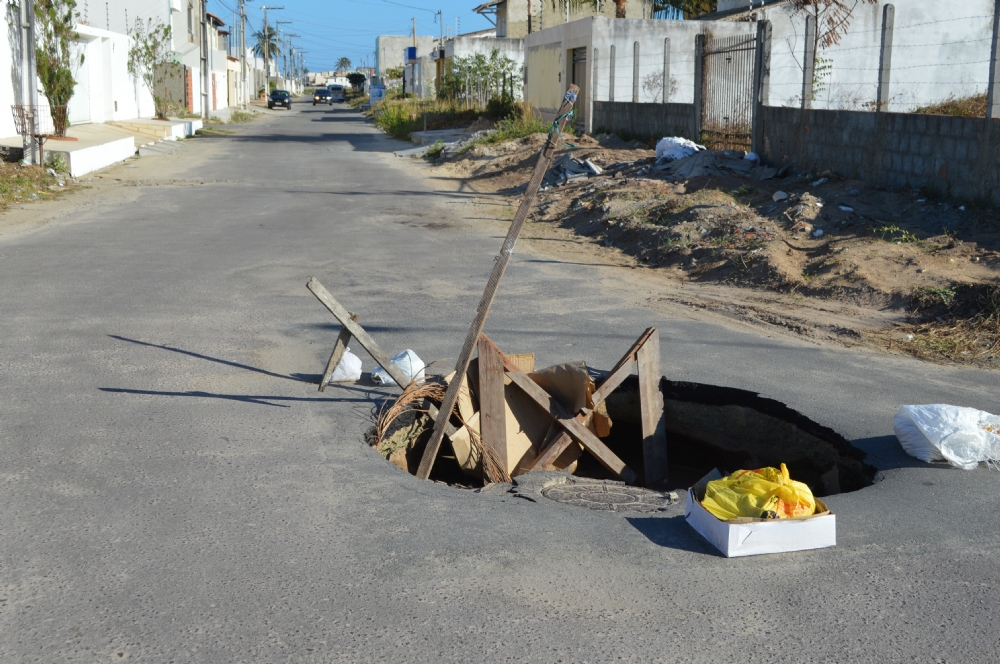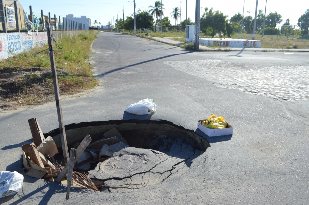 Segundo moradores, o local não possui escoamento de água, e para alertar sobre o perigo aos motoristas e pedestres que passam pelo local, que fica num cruzamento de ruas, eles colocaram objetos ao redor do buraco.