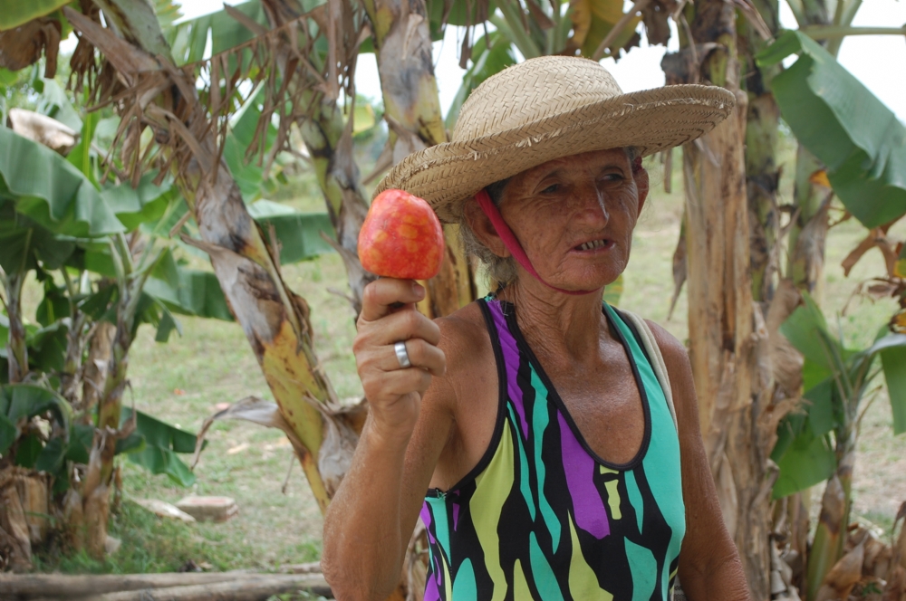 | D. Carmosa exibe o caju produzido no local e lamenta a destruição das casas (Fotos: Portal Infonet) |