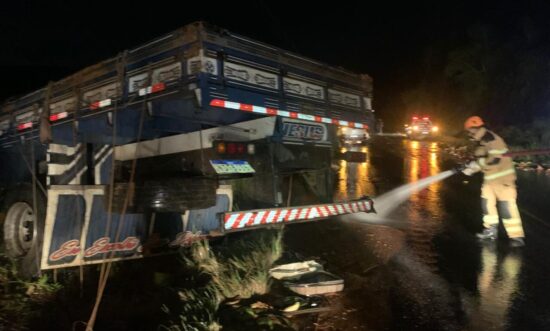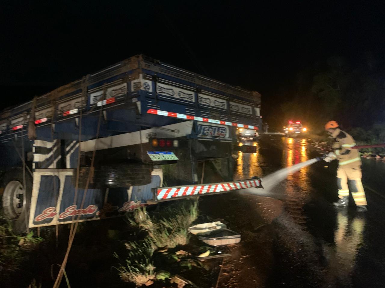 Com uma grande parte da carga espalhada pela rodovia e a presença de muita lama, agravada pelas chuvas, a pista apresentava alto risco de novos acidentes. Diante da situação, a equipe realizou a limpeza e lavagem da via, eliminando resíduos e estabelecendo condições seguras para o tráfego.