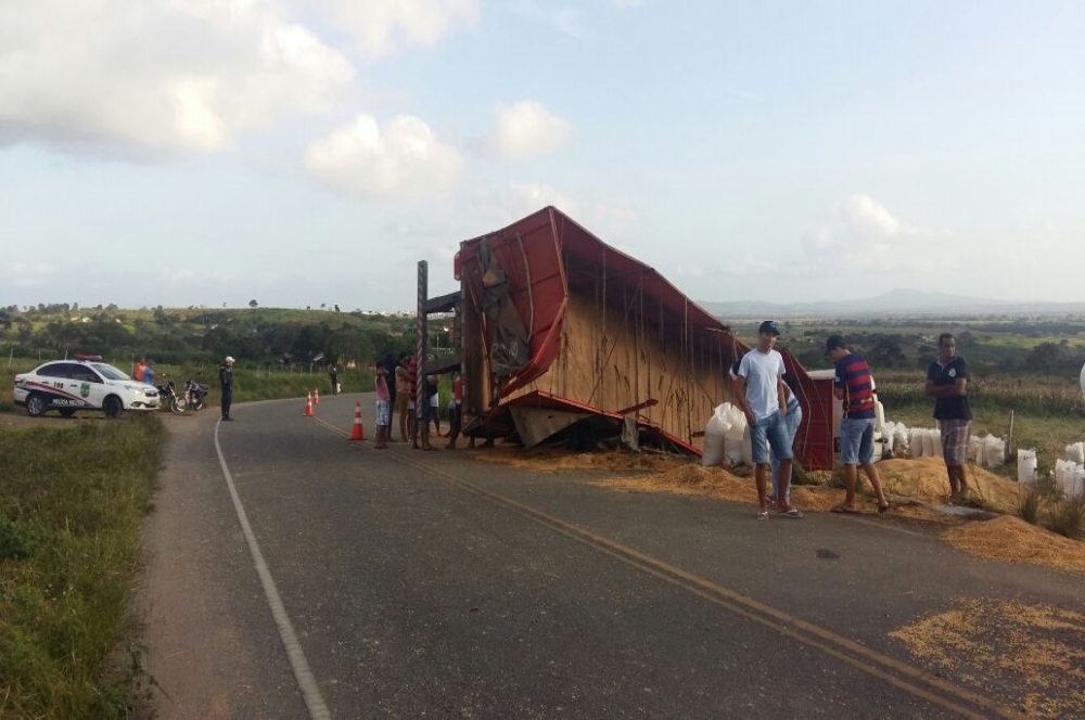 De acordo com o major Deny Ricardo, do Batalhão de Polícia Rodoviária Estadual (BPRv) da Polícia Militar (PM), o motorista precisou desviar o veículo, perdeu o controle e tombou lateralmente na via. O caminhão estava carregado de grãos.