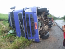 Um caminhão com carga de madeira tombou na BR 235 nas imediações da cidade de Itabaiana, na manhã desta quinta-feira, 2. De acordo com informações de outros caminhoneiros que estavam no local e não quiseram se identificar, o motorista do veículo teria sobrado em uma curva e tombado no acostamento. Caminhão carregava madeiras e tombou na pista (Foto: Portal Infonet)