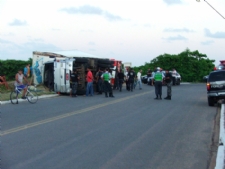 Um caminhão carregando peças para móveis tombou no final da tarde de hoje, 19, nas proximidades do Farol da Coroa do Meio. O acidente deixou duas pessoas feridas, o motorista do veículo, João Batista Marques, sofreu ferimentos leves.