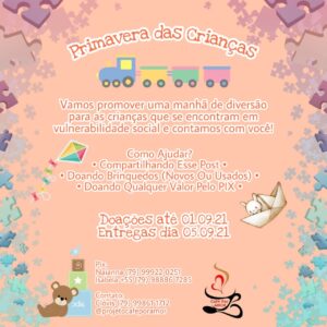 Uma campanha realizada por voluntários do Projeto Café por Amor está arrecadando brinquedos novos ou usados para crianças em situação de vulnerabilidade social. A ação “Primavera das Crianças” acontecerá no dia 5 de setembro e será direcionada para crianças do Centro de Aracaju.